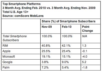 Selon ComScore, l’entreprise de recherche marketing Internet, Android est la plateforme de smartphone qui a eu la plus forte progression au cours des mois de novembre 2009 et février 2010. Le système d’exploitation de Google a gagné plus de 5 points de pourcentage au cours de cette période.