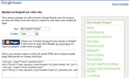 Une nouvelle fonctionnalité a été ajoutée à Google Reader cette semaine. Vous pouvez maintenant créer une blogroll et l’exporter sur votre blogue. Pour la créer, rien de plus simple, cliquez sur « Settings » dans le coin supérieur droit de la fenêtre. Maintenant, sélectionnez l’onglet Tags, vous apercevrez tous les tags de votre compte. À droite de chacun des tags, sélectionnez « ajouter une blogroll à votre site ». Aussitôt, Google Reader générera le code de votre blogroll. Bien entendu, vous devez associer les flux de votre blogroll à un même tag.