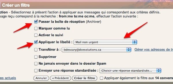 Ces deux filtres qui se mettent en place en quelques secondes élimineront de votre boîte de réception les messages dont vous n’êtes pas le seul destinataire. Par exemple, si vous êtes en CC sur un mail ou s’il s’agit d’une liste de distribution. Plutôt que d’arriver directement sur la boîte de réception, ces messages seront automatiquement classés dans un répertoire (libellé).