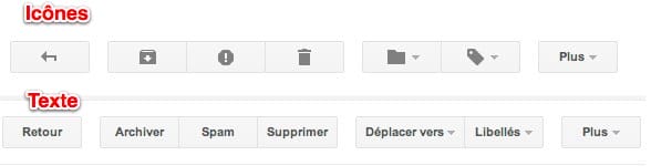 Débutons avec les boutons de la barre d’outils. Ce sont les icônes qui apparaissent au-dessus des messages. Elles vous permettent entre autres d’archiver, de marquer comme spam, de supprimer ou encore d’attribuer des libellés à vos mails. Ces icônes peuvent être remplacées par des boutons texte. Pour effectuer cette modification, rendez-vous dans Paramètres – Général. Sélectionnez Libellés des boutons.