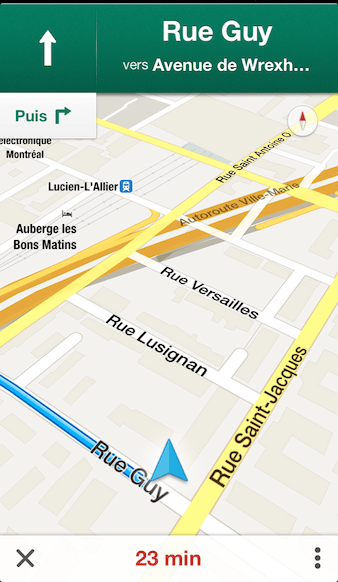 Sur la version Android, Maps et Navigations sont en fait deux applications distinctes. Alors que sur l’iPhone ces deux applications ont été fusionnées en une seule qui se nomme Maps. Elle vous donne accès aux fonctionnalités de base de Google Maps ainsi que la navigation assistée par la voix. Je n’ai pas encore testé la fonctionnalité «Navigation». Cependant, elle est identique à ce qui est déjà offert sur Android, donc, nickel.