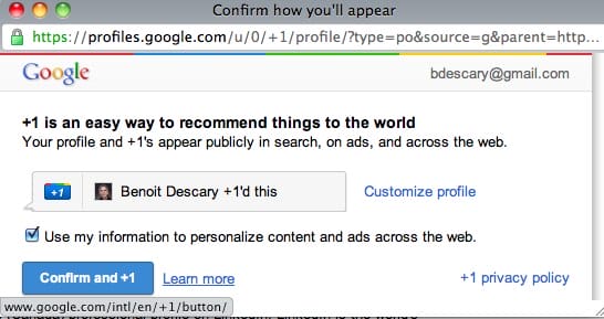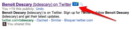 Si l’un des membres de votre cercle social effectue une recherche similaire à la vôtre, il apercevra les résultats de recherche que vous avez identifiés avec le bouton Google +1. En principe, comme les résultats identifiés avec ce bouton sont soumis par les membres de votre cercle social, ils devraient être plus pertinents. Les sites que vous avez identifiés avec le bouton +1 apparaîtront aussi sur votre profil Google.