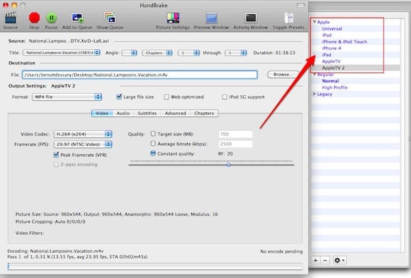 La nouvelle version d’Handbrake offre des paramètres de conversion automatisés vers l’Apple TV 2, l’iPad et l’iPhone 4. En plus de transformer vos DVD en fichiers numériques, Handbrake convertira aussi les fichiers DiVX au format MP4.