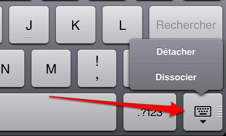 Pour détacher ou dissocier votre clavier, appuyez et maintenez la pression sur la touche qui se trouve dans le coin inférieur gauche du clavier. Cette touche à une double fonctionnalité, si vous appuyez brièvement elle fermera le clavier. Une pression prolongée détachera ou dissociera le clavier.