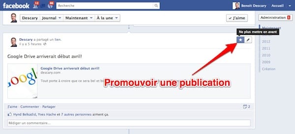 Vous pouvez mettre de l’avant une ou plusieurs publications de votre Page Facebook. Cette action affichera la publication sur la totalité de la colonne centrale, ce qui la rendra évidemment plus visible. Pour mettre de l’avant une publication, cliquez sur l’étoile qui apparaît dans le coin supérieur droit de la publication.