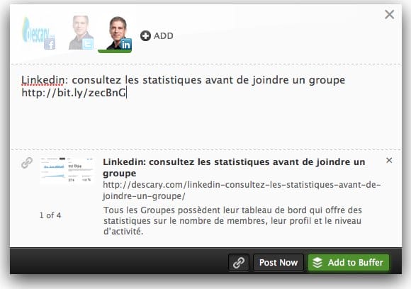 L’intégration de Linkedin à Buffer se limite pour l’instant à la mise à jour de statuts (partagez une nouvelle). Il est impossible de publier sur les groupes. Buffer est à mon avis un excellent service. Utilisez-vous un service qui permet de différer vos publications sur les médias sociaux?
