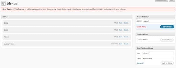 Des menus personnalisables: il ne sera plus nécessaire d’installer un plugin ou de modifier le code de l’entête à la main pour installer et créer un menu sur votre blogue. WordPress 3.0 offre un outil de gestion des menus. Pour l’instant, la fonctionnalité est assez limitée, mais à terme elle devrait permettre une gestion complète des menus.